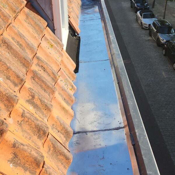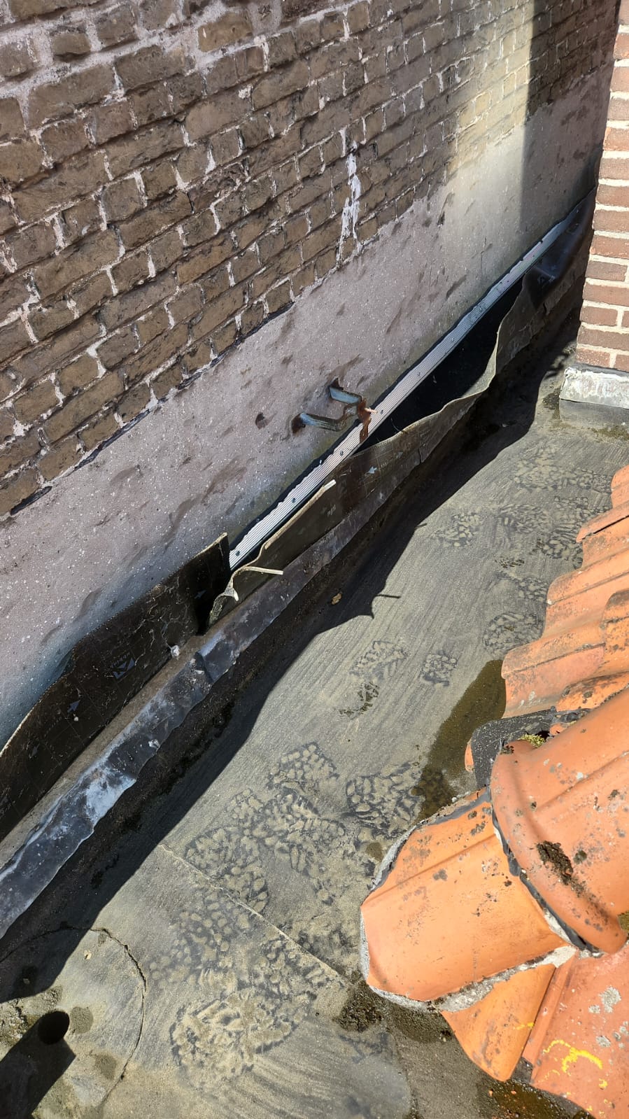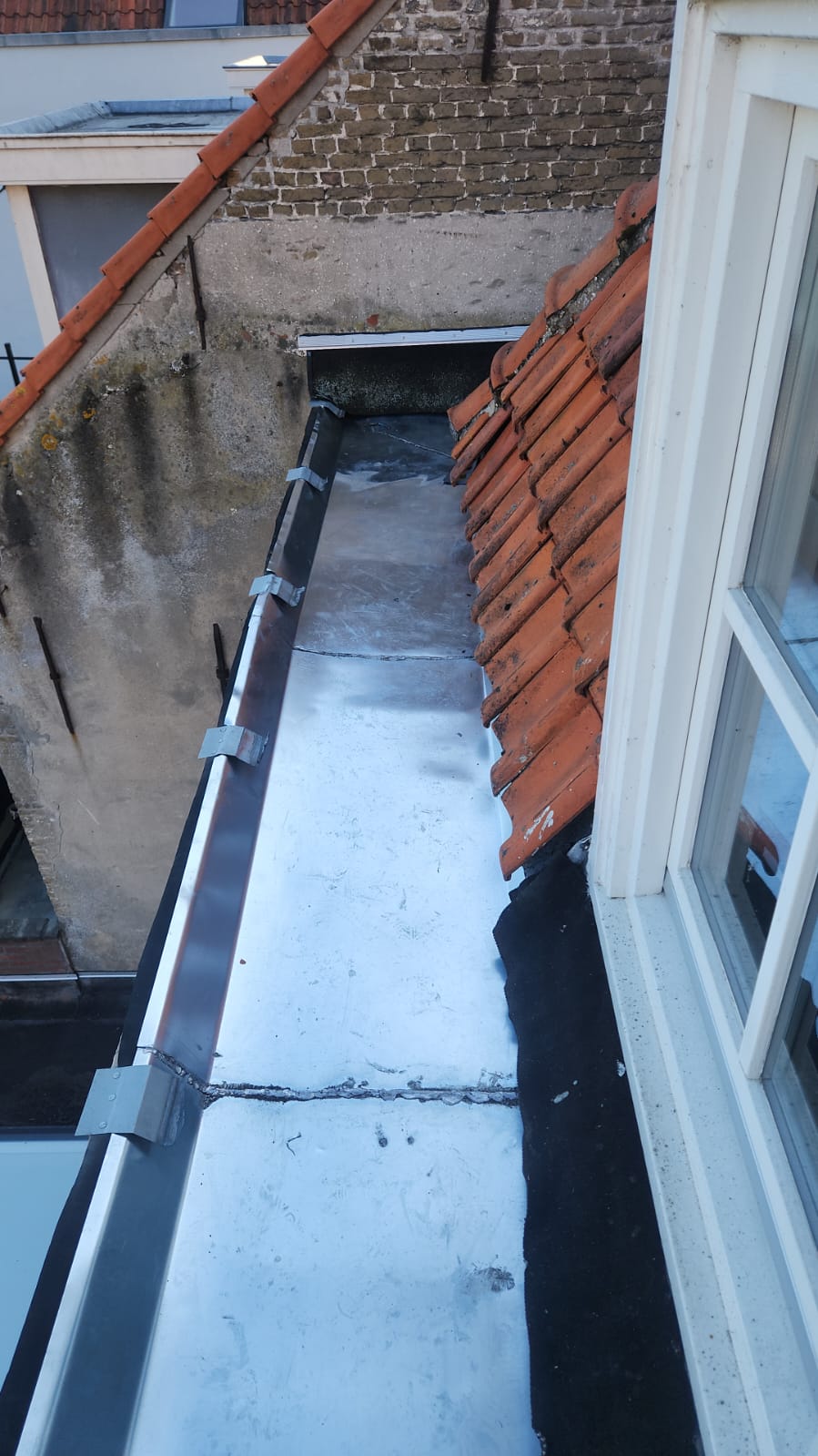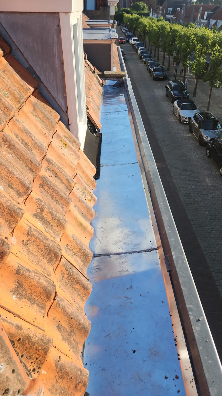 Situatie: Dit project betrof een jaren '80 woning in Den Haag waar de bestaande PVC dakgoot ernstige lekkageproblemen veroorzaakte. De goot vertoonde scheuren ter hoogte van de verbindingen en had onvoldoende afschot, wat resulteerde in wateroverlast en vochtschade aan de gevel.