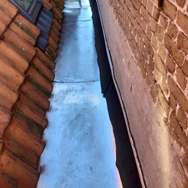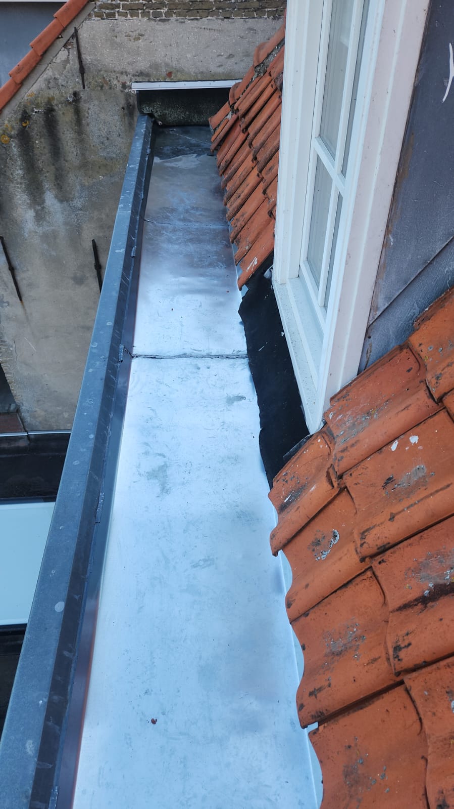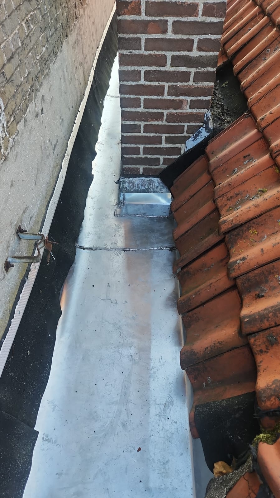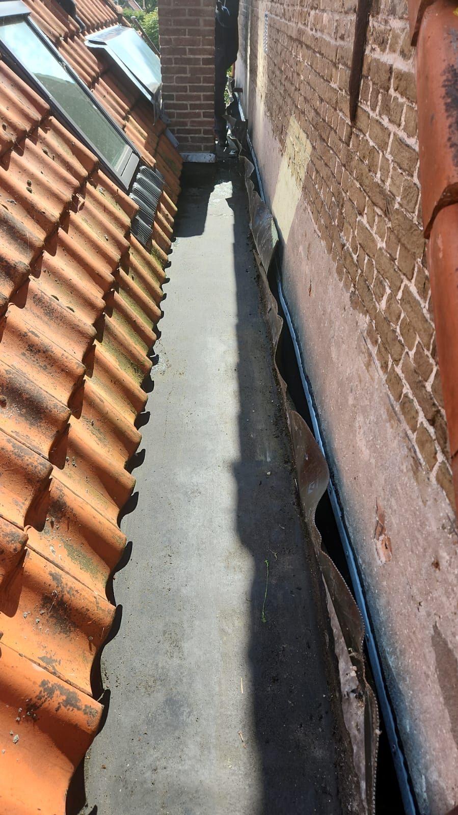 Situatie: Dit project betrof een jaren '80 woning in Den Haag waar de bestaande PVC dakgoot ernstige lekkageproblemen veroorzaakte. De goot vertoonde scheuren ter hoogte van de verbindingen en had onvoldoende afschot, wat resulteerde in wateroverlast en vochtschade aan de gevel.